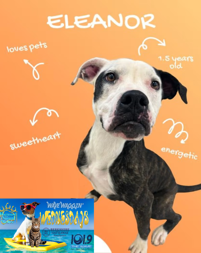 Meet Eleanor, an American Bulldog mix and this week’s featured Wave Waggin’ Wednesday pet. She was found as a stray and while she did have a microchip, her owner was unable to be located. Eleanor is a sweet dog and loves getting lots of attention. She has a very high energy level and needs at least an hour a day to run, play and burn up energy. Eleanor needs an owner who will be consistent in continuing her training. She’s good around other dogs and, as result of her training at Puppies for Parole knows commands like sit, down, come, stay and more. This happy girl likes all toys but absolutely loves rope toys! Pay her a visit at Dogwood Animal Shelter!